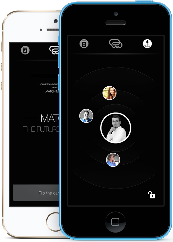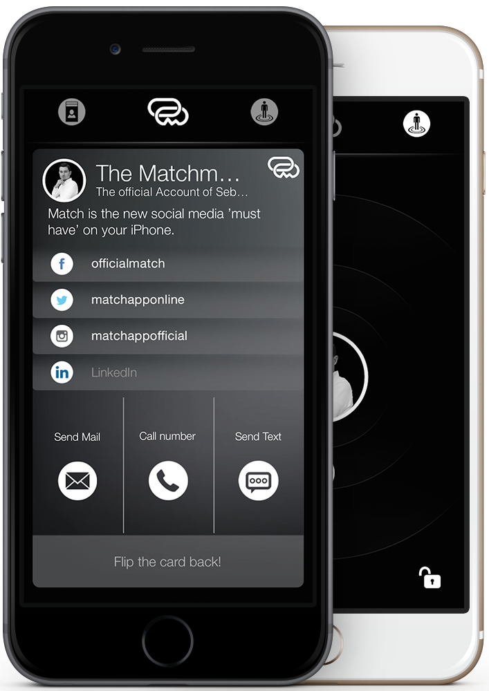 See who's around, tap the card and find a possible Match. For example with your personal card you can see who is at a birthday, Match old family members or just browse around. By activating your business card you can expand the way you do your job or enlarge your company by matching new employees. Of course that could be also vice versa. At night, activate your nightlife card and discover so much more than just going to a club, why asking someones phone number? Just open Match and ask them without stepping forward. Remember that moment when you forgot a name? Just open your Match Near U screen and recall that name!
